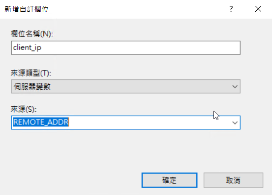 以此範例來說,新增一個名為 client_ip 的欄位,並設定來源類型為 伺服器變數,來源名稱為 REMOTE_ADDR。這樣,IIS日誌將包含一個新的 client_ip 欄位,用於記錄每個請求的客戶端IP地址。
